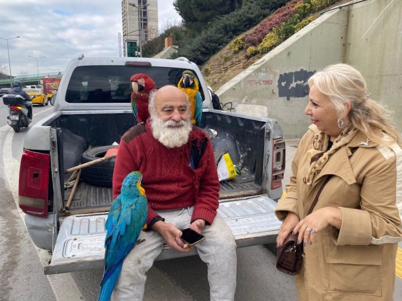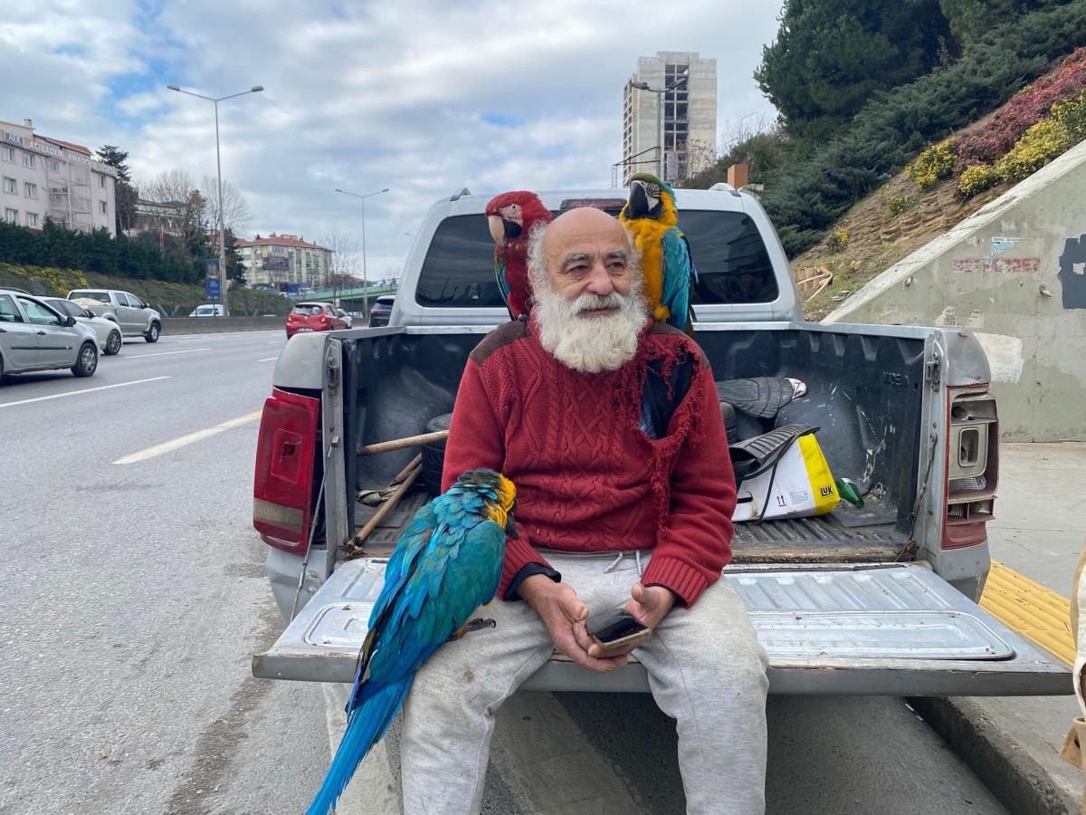 14 tane papağanım var, ben her yere gidiyorum. Beni Kadıköy'de de görebilirsiniz, Taksim'de de görebilirsiniz. Yalnız yaşıyorum, ölünceye kadar hayatım böyle devam ediyor.