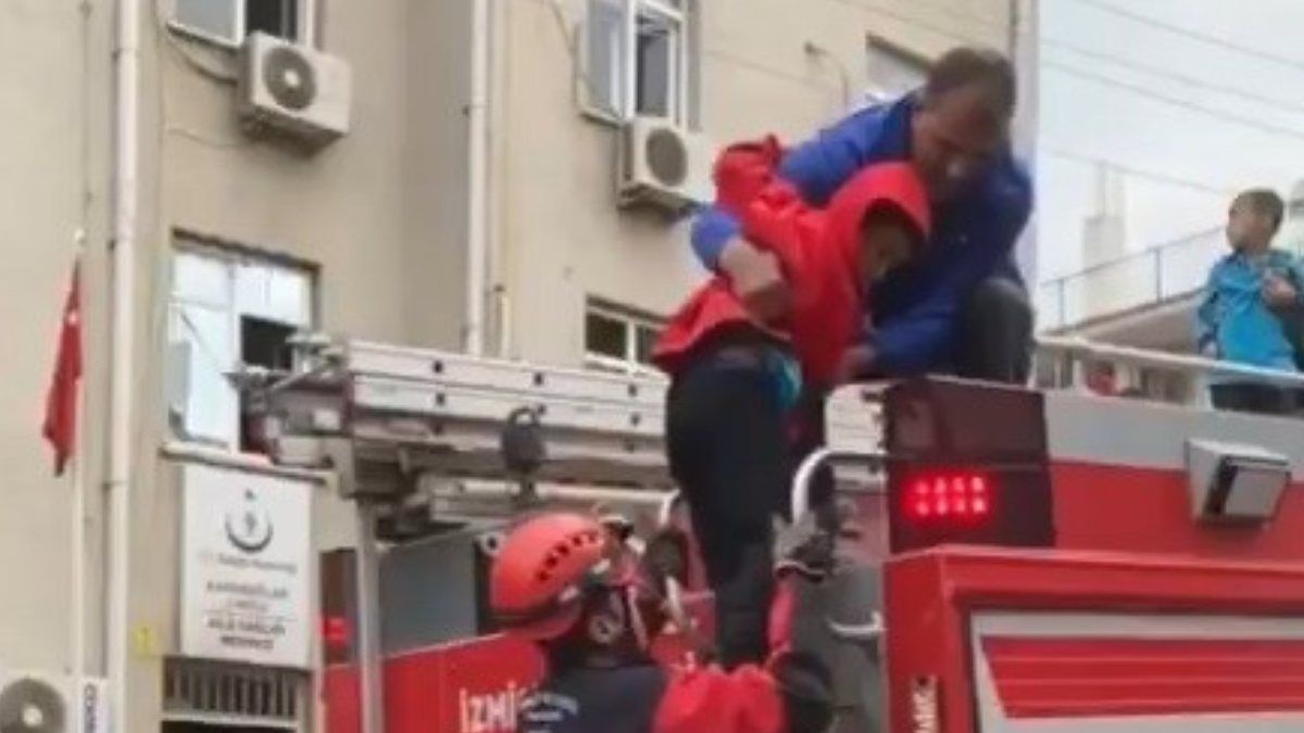 Üst katlarda mahsur kalan vatandaşlar için yangın merdiveni uzatılırken 3'ü çocuk 13 kişi, itfaiye ekipleri tarafından yangın merdiveniyle binadan tahliye edildi.