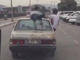 İzmir'de araç üstünde tehlikeli yolculuk VİDEO
