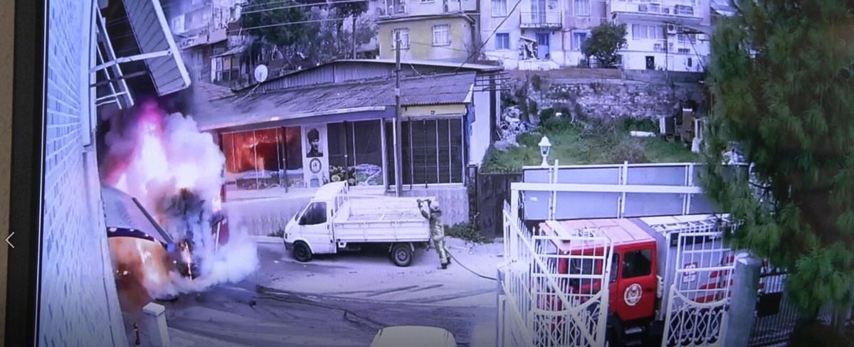 Cadde trafiğe kapatılırken, alevlere müdahale anları güvenlik kamerasına yansıdı.