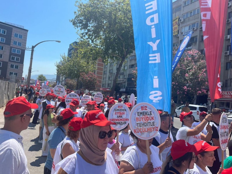 Bu kapsamda Belediye-İş Sendikası'na bağlı işçiler, sendika binası önünde toplanıp, Başkan Cemil Tugay'ın ofisinin de yer aldığı Egemenlik Binası'na yürüdü.