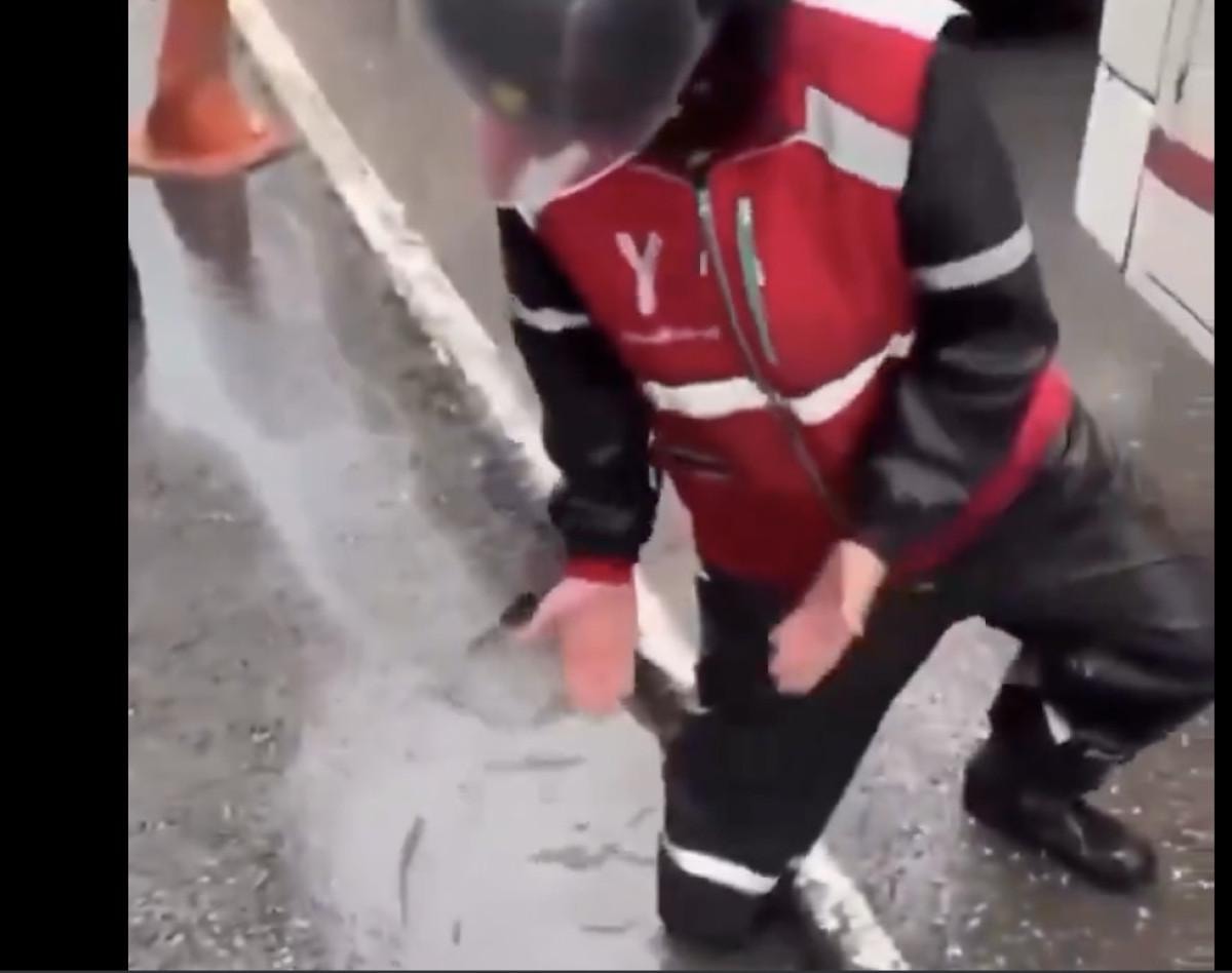 Kazada motokurye yerden kalkamazken, yağmur suyu dolu çukur ise tepki çekti.
