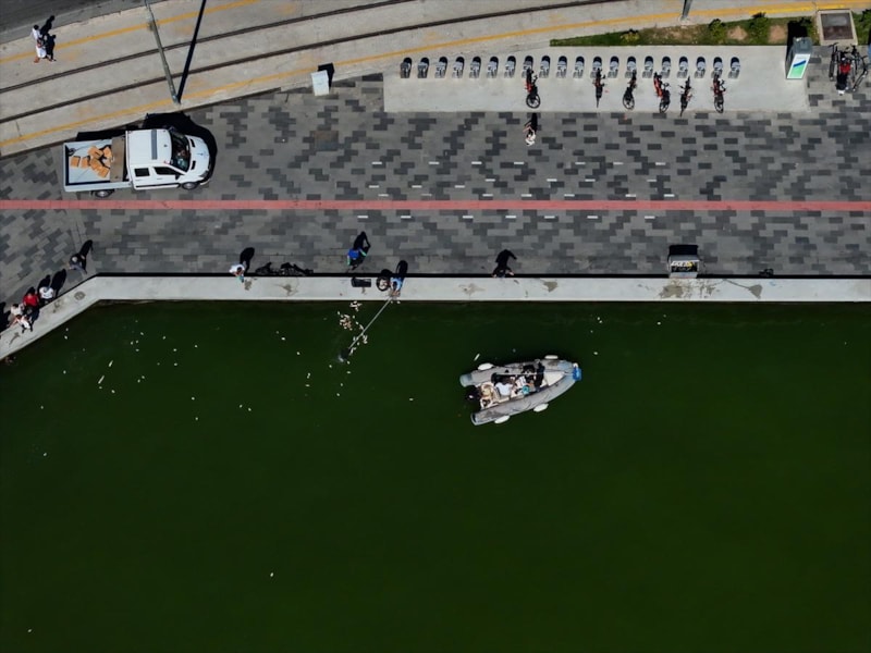 Deniz yüzeyindeki ölü balıklar dron ile görüntülenirken, İzmir Büyükşehir Belediyesi ekipleri ise hem açık denizde hem de kıyadan ölü balıkları toplama çalışması başlattı.