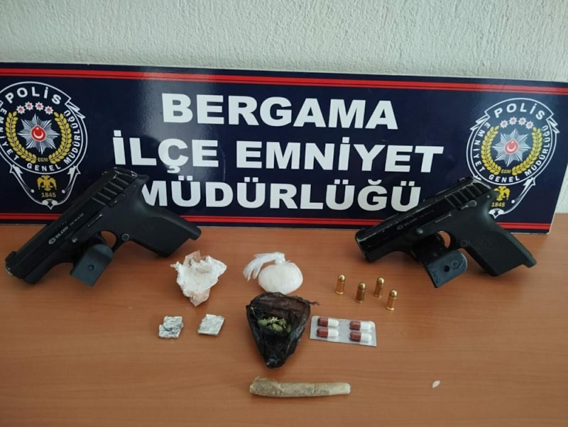 Aramada S.Ş.'nin üzerinde 2.91 gram esrar, 6.62 gram metamfetamin ve 4 adet sentetik ecza ele geçirilirken çantasında ise tarihi eser niteliğinde 2 altın sikke bulundu.