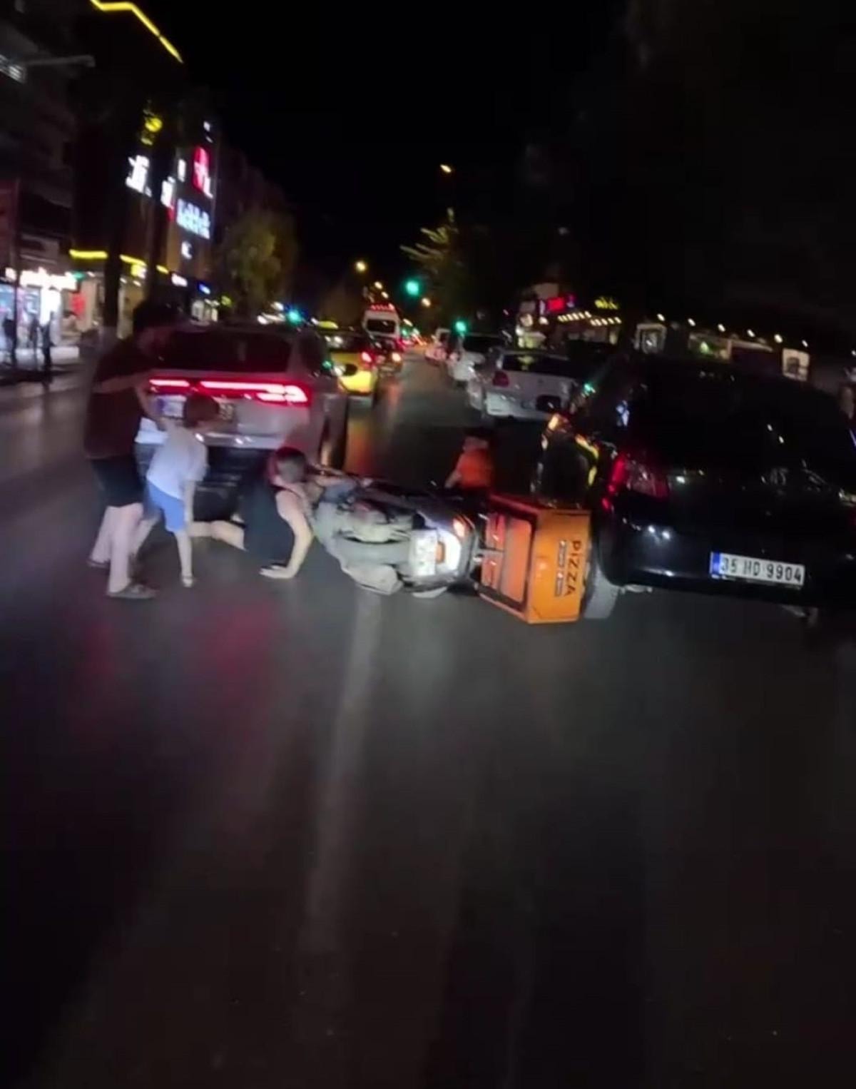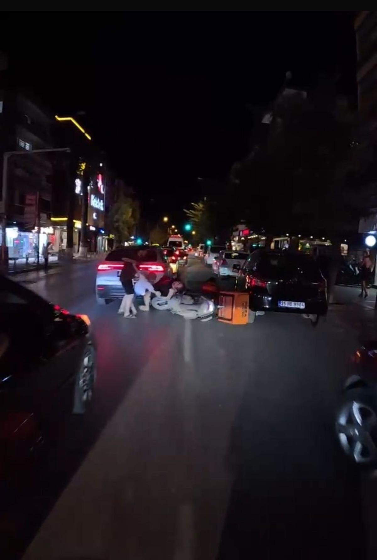 İzmir'in Buca ilçesi Menderes Caddesi’nde meydana gelen olayda hızla seyir haldeki motosikletli kurye, araçların arasından yolun karşısına geçmeye çalışan aileyi fark etmedi.