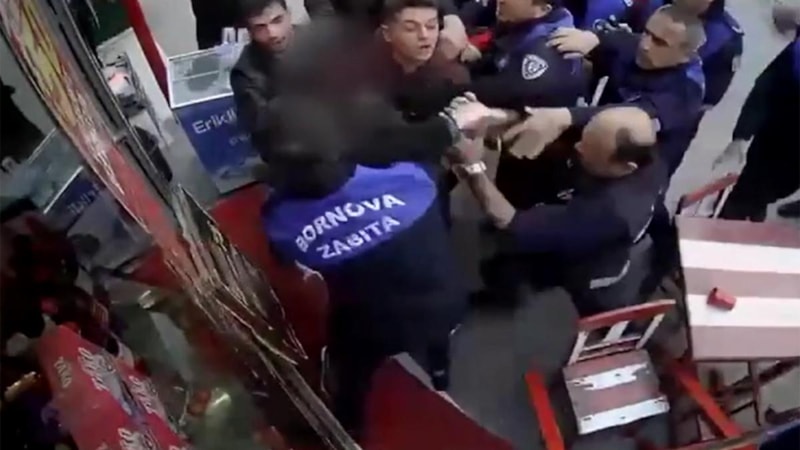 İzmir'de kaldırımı işgal ettiği ileri sürülen esnaf ile zabıtaların kavgası güvenlik kamerasına yansıdı.
