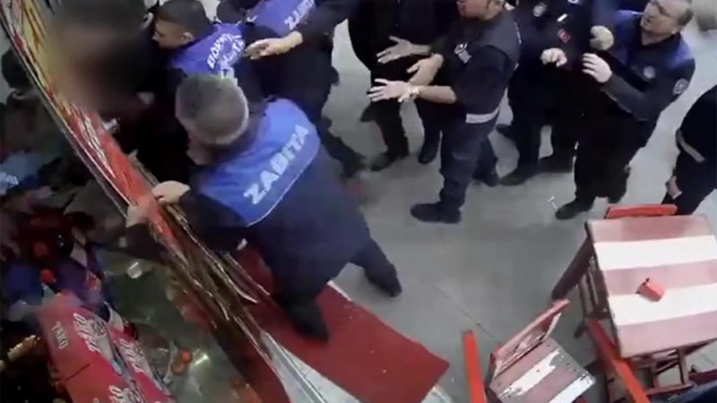 Görüntülerde çok sayıda zabıta ekibinin esnafa müdahalesi, çevredeki esnafın araya girmesiyle kavganın sona ermesi yer alıyor.