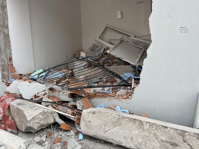 Çarpmanın etkisiyle evin oturma odasına ait duvar büyük ölçüde yıkıldı.