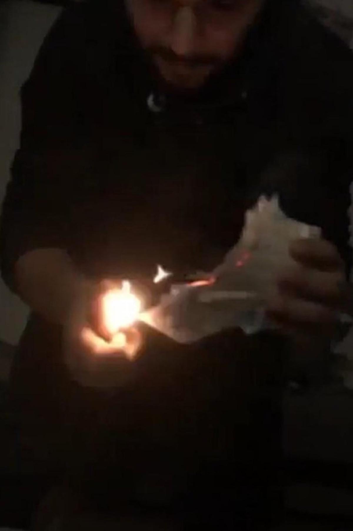Bir evde içki içen kişi, Kur'an-ı Kerim'i yırtıp ateşe verdi. Karşısındaki kişi de o anları cep telefonu kamerası ile kaydetti.