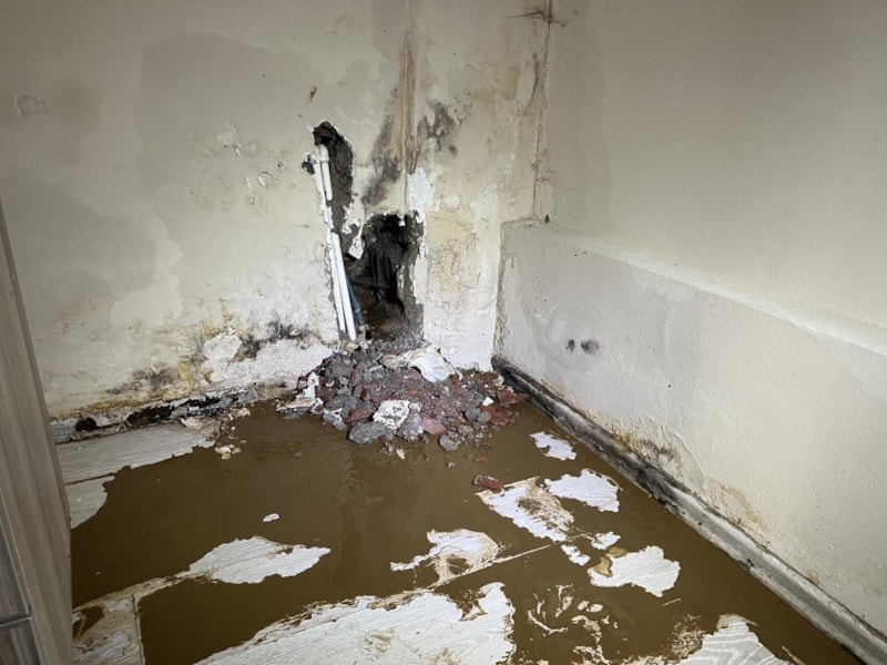 Haftalardır su içinde kalan evin duvarlarında rutubet ve çürüme meydana gelirken, laminat parkeler ve mutfak dolapları da zarar gördü.
