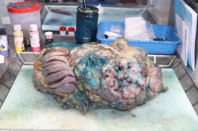 Laboratuvarımıza 38,29,13 santim boyutlarında, 10 kilo ağırlığında bir kitle geldi. Patoloji sonucu sayesinde hastamız tedavisini alabilecek. Ancak bu işlemler patolojide, yaklaşık 3 hafta kadar süreyle devam etmektedir. Cerrahi olarak çıkartılan tüm materyallerin mutlaka patolojik incelemesinin yapılması gerekmektedir. Bu tip bir batın içi kitle, mide kaynaklı bir gastrointestinal stromal tümör (GIST) olabileceği gibi, dediferansiye liposarkom gibi diğer mezenkimal tümörler olabilir.