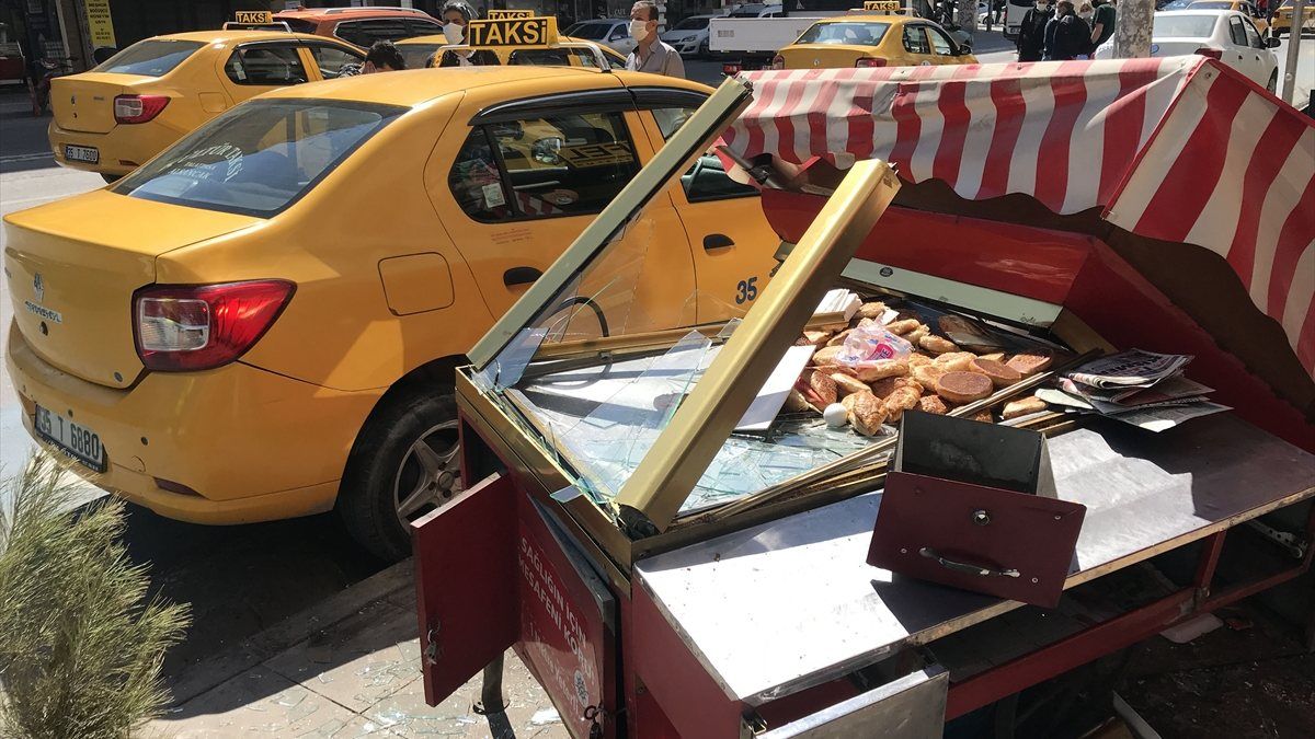 İzmir'de kazaya karışan taksi simitçi tezgahına çarptı