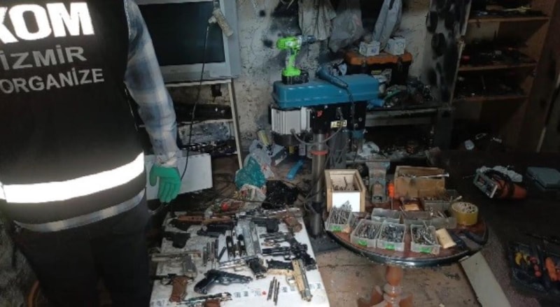 İzmir'de polis ekipleri tarafından 3 ayrı adrese gerçekleştirilen operasyonda, silah imalatında kullanılan çok sayıda malzeme ele geçirildi.