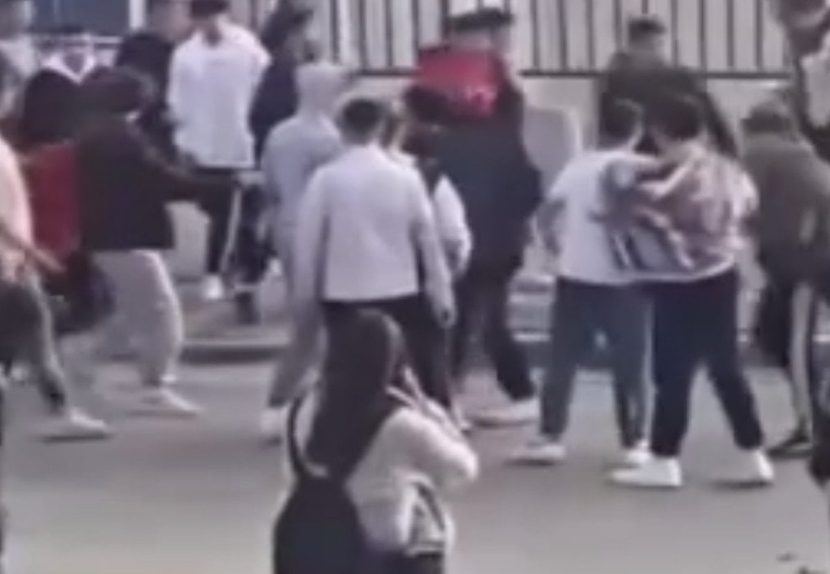 Onlarca öğrencinin birbirine girdiği kavgada, gençler sokak ortasında tekme ve tokatlarla birbirine saldırdı.