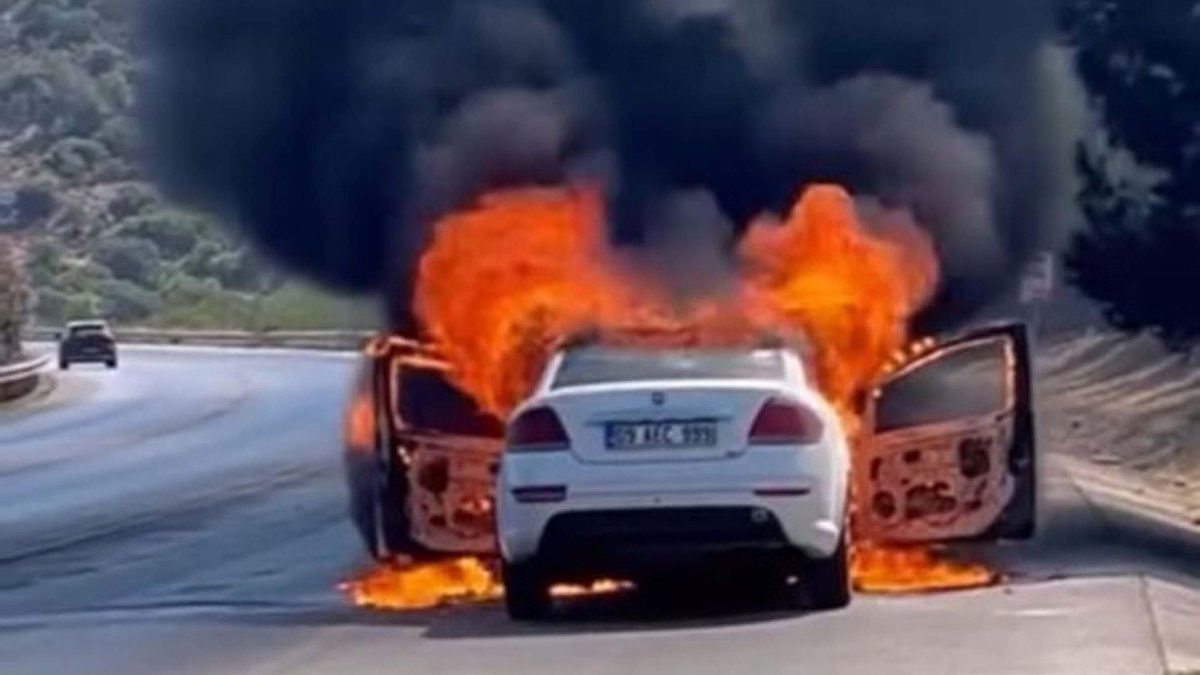 İzmir-Çeşme Otoyolu'nda İzmir yönüne giden otomobil, saat 11.30 sıralarında Güzelbahçe mevkiine geldiğinde alev aldı.