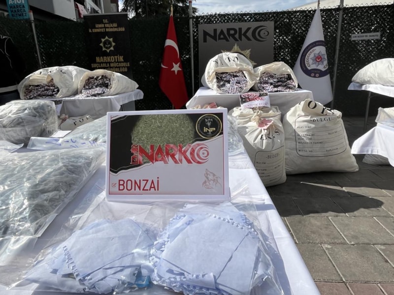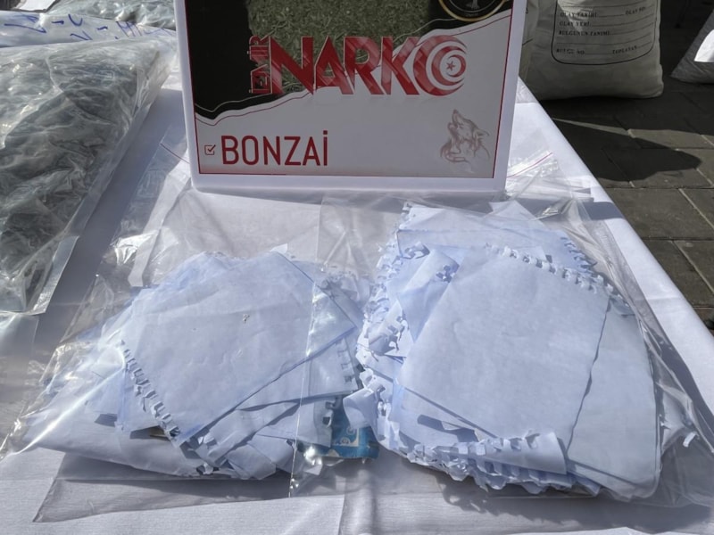 Şüphelilerin yanındaki poşette yapılan aramada, 126 sayfaya emdirilmiş şekilde 50 bin içimlik sentetik bonzai ele geçirildi.