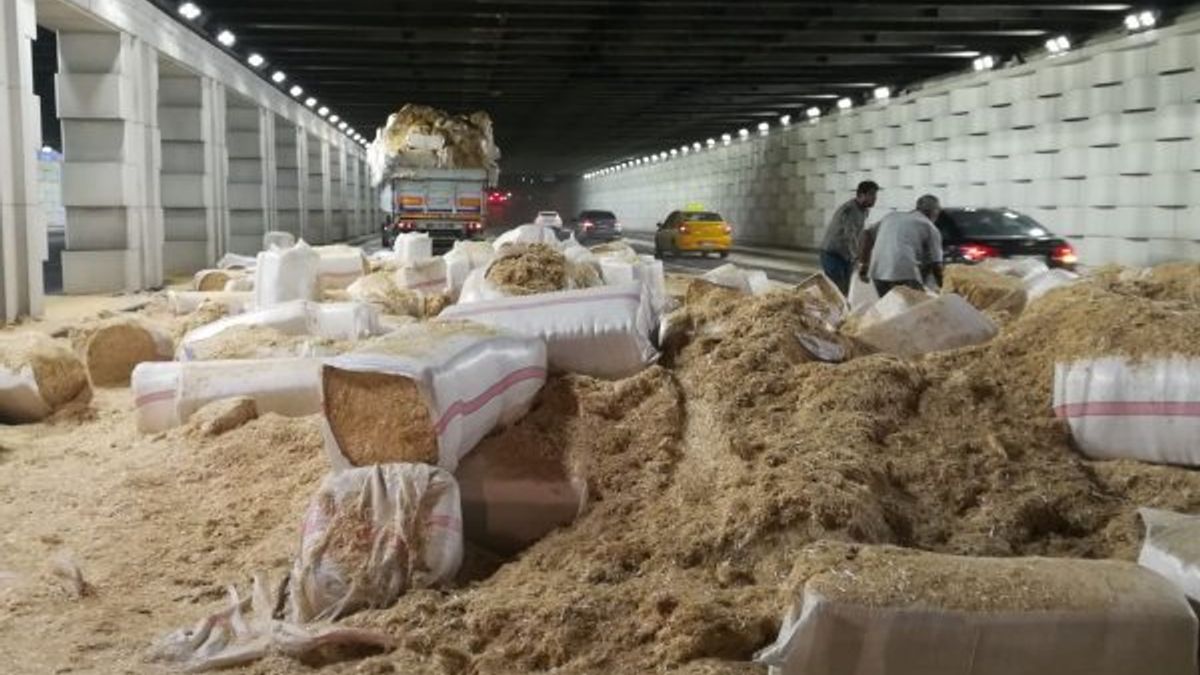 Sıkışma nedeniyle dorsede bulunan samanlar yola saçılırken, trafikte uzun kuyruklar oluştu.