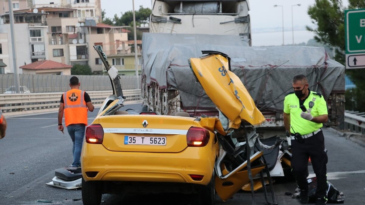 İzmir-Çeşme otoyolu Balçova viyadüğü yakınlarında Engin B. (43) idaresindeki 35 T 5623 plakalı taksi, önünde seyreden Selman A. (38) yönetimindeki 35 KC 1060 plakalı tırın dorse kısmına çarptı.