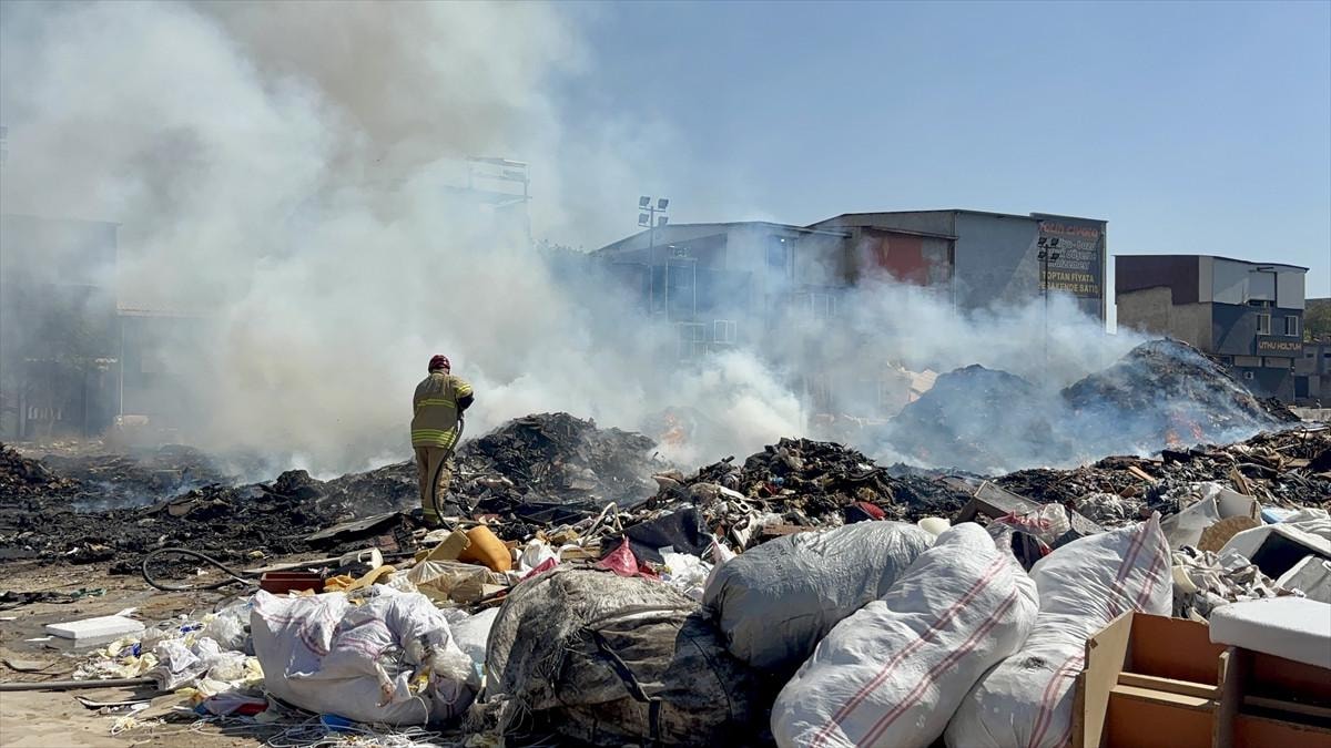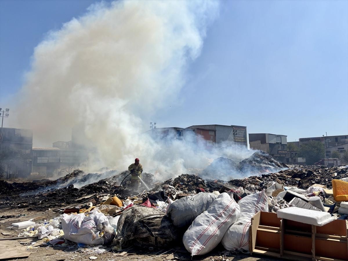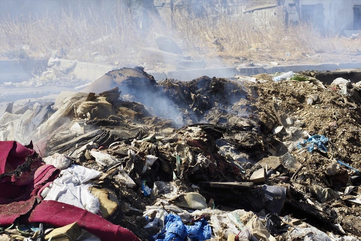 Yine aynı mahallede futbol sahası büyüklüğündeki bir alana dökülen evsel atık, plastik, tekstil ve moloz yığınlarında yangın meydana geliyor.