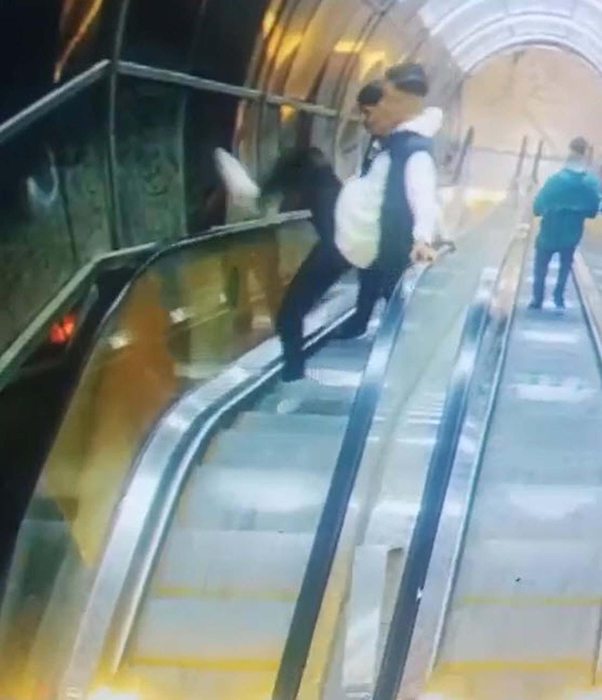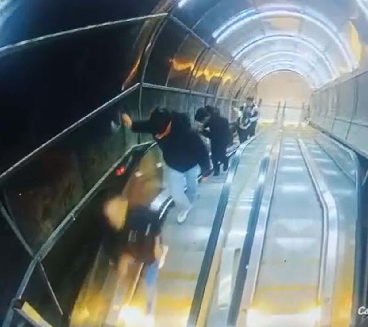Yürüyen merdiveni kullanan 5 kişi, merdivenin yanındaki plastik korkuluklara yumruk ve tekmelerle zarar verdi.