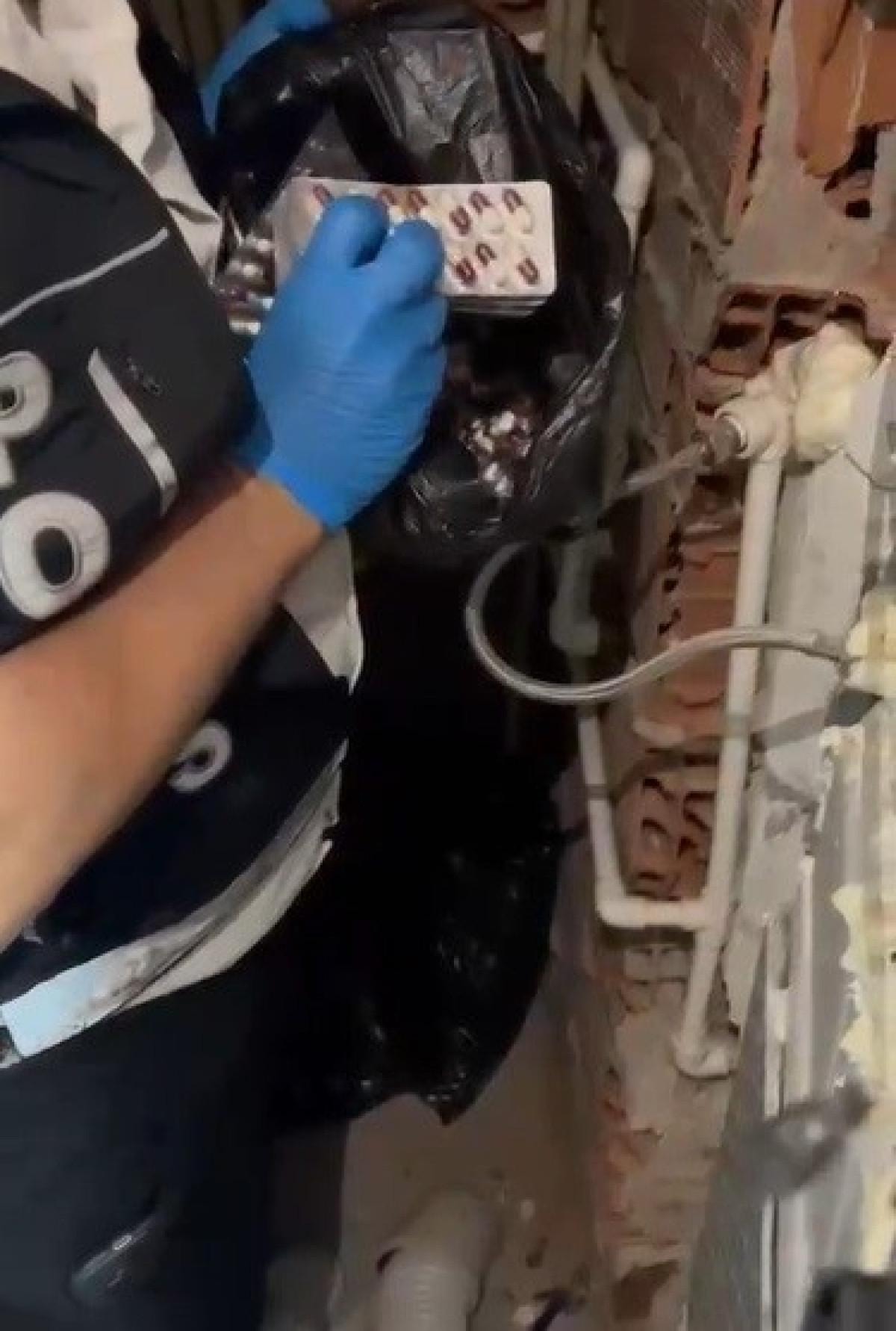Polisin ikna çabalarıyla kapıya dönüştürülen duvarın arkasında, elleri yukarıda bulunan kişinin C.A. olduğu belirlendi. C.A., polis ekipleri tarafından yakalanırken, gizlendiği yerde poşetler içinde toplam 3.612 adet uyuşturucu hap ele geçirildi. Ayrıca, adreste yapılan aramalarda 3 tüfek ve 17 tüfek fişeği de bulundu.