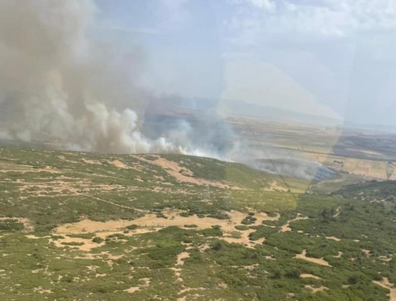 İzmir’in Foça ilçesindeki ziraat arazisinde başlayan daha sonra ormanlık alana sirayet eden yangına havadan ve karadan müdahale ediliyor.