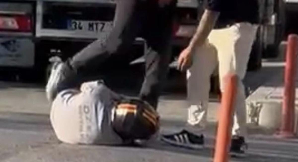 Bu sırada otomobildeki 2 kişi, yerdeki motosiklet sürücüsüne defalarca tekme attı.