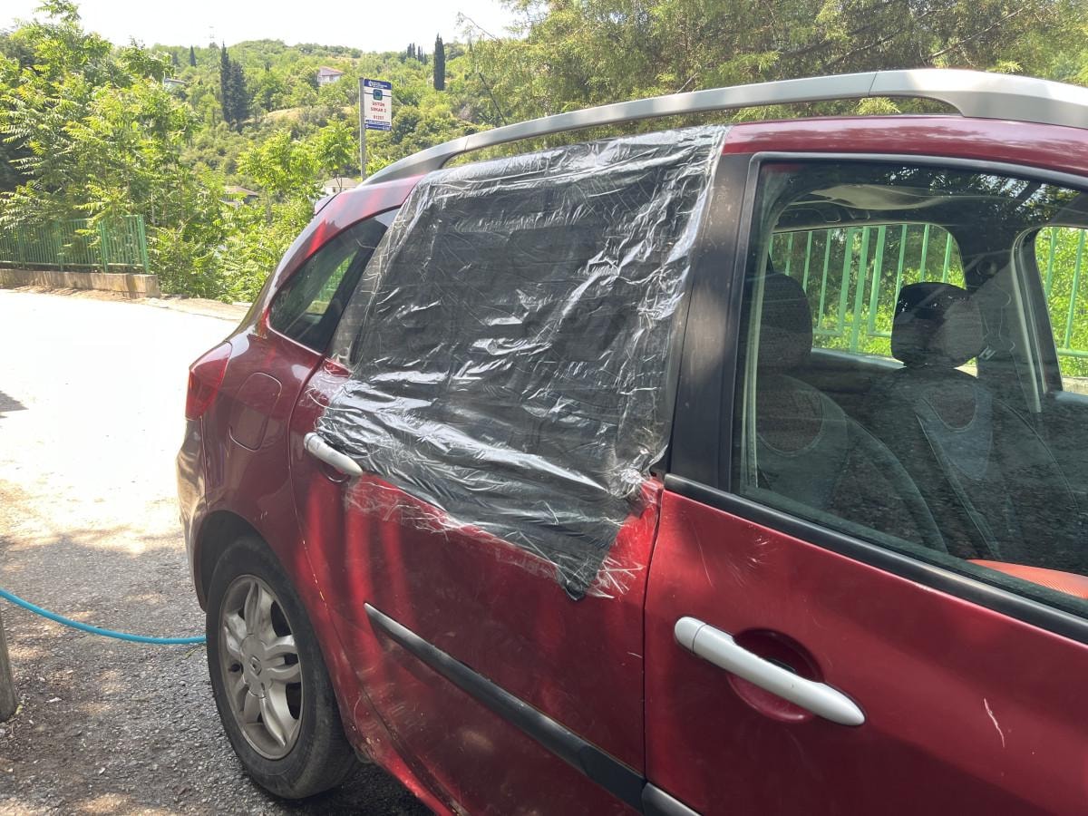 Otomobilde hasar oluşurken boğa, sahipleri tarafından düştüğü yerinden çıkarılarak sokaktaki demir çitlere bağlandı.