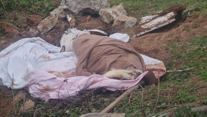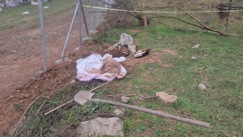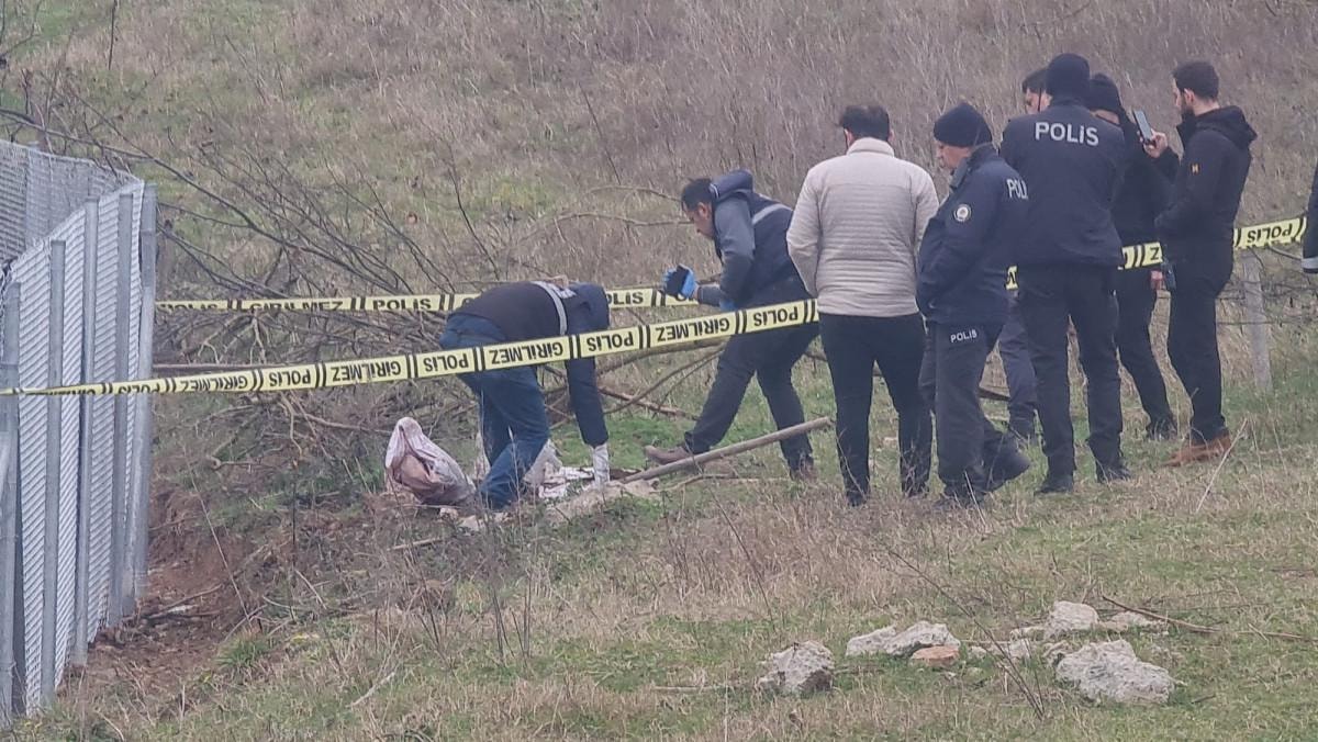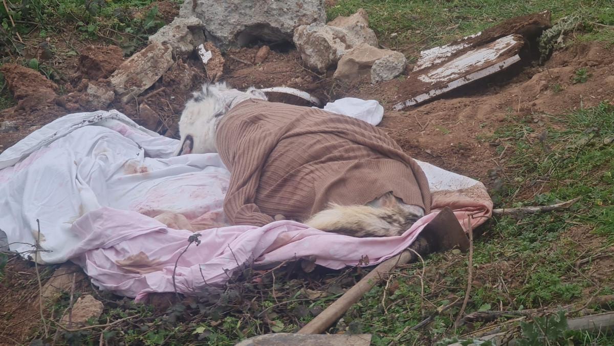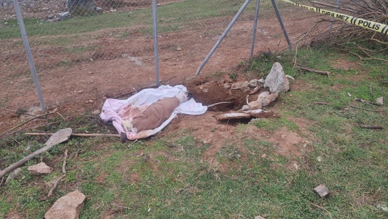 Mezarda yaklaşık 1 metre derinlikte, çarşafa sarılmış köpek ölüsü bulundu.