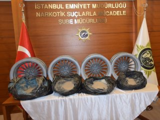 Otomobilin tekerlekleri söken ekipler, 4 lastik jantı içine gizlenmiş 21 kilo eroin ele geçirdi.