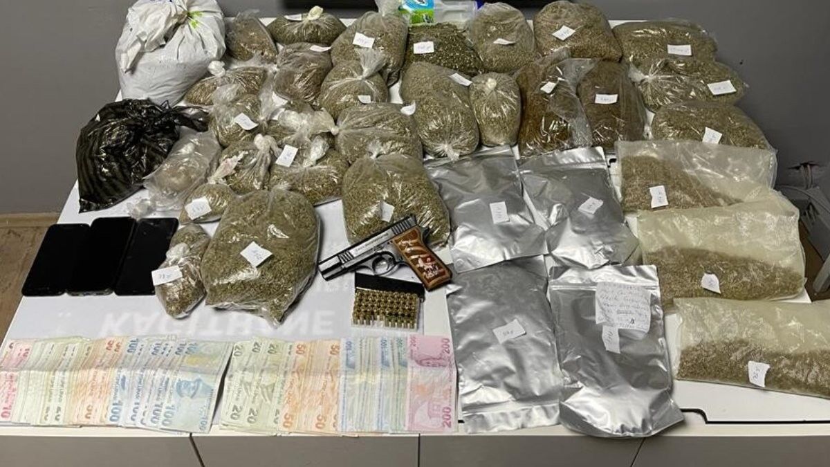 Daha sonra şahsın adresine operasyon düzenleyen ekipler, merdivenin içerisinde gizlenmiş yaklaşık 7.5 kilogram marihuana ele geçirdi. Aramalara devam eden ekipler, 15 adet Hint kök keneviri, ruhsatsız tabanca ve 49 adet mermi, uyuşturucu madde ticaretinden elde edildiği düşünülen 2 bin 485 lira ve 2 adet cep telefonu buldu.