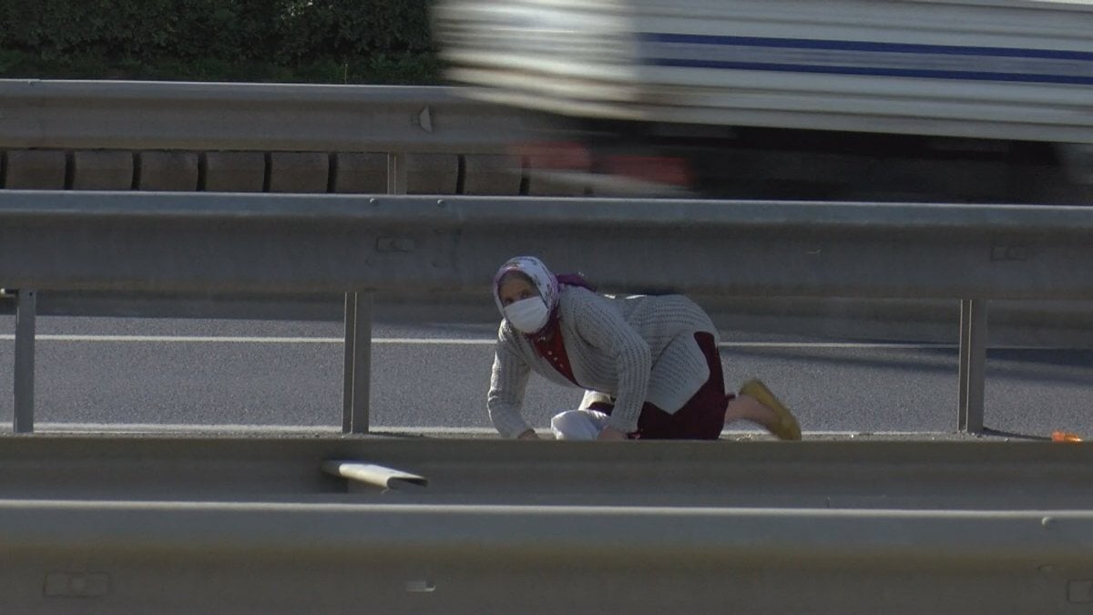 Emniyete şeridinde de yürümek zorunda kalanlar daha sonra yolun karşısına geçmek için bariyerden atlayarak hem kendi hayatlarını hem de sürücüleri tehlikeye atıyor.