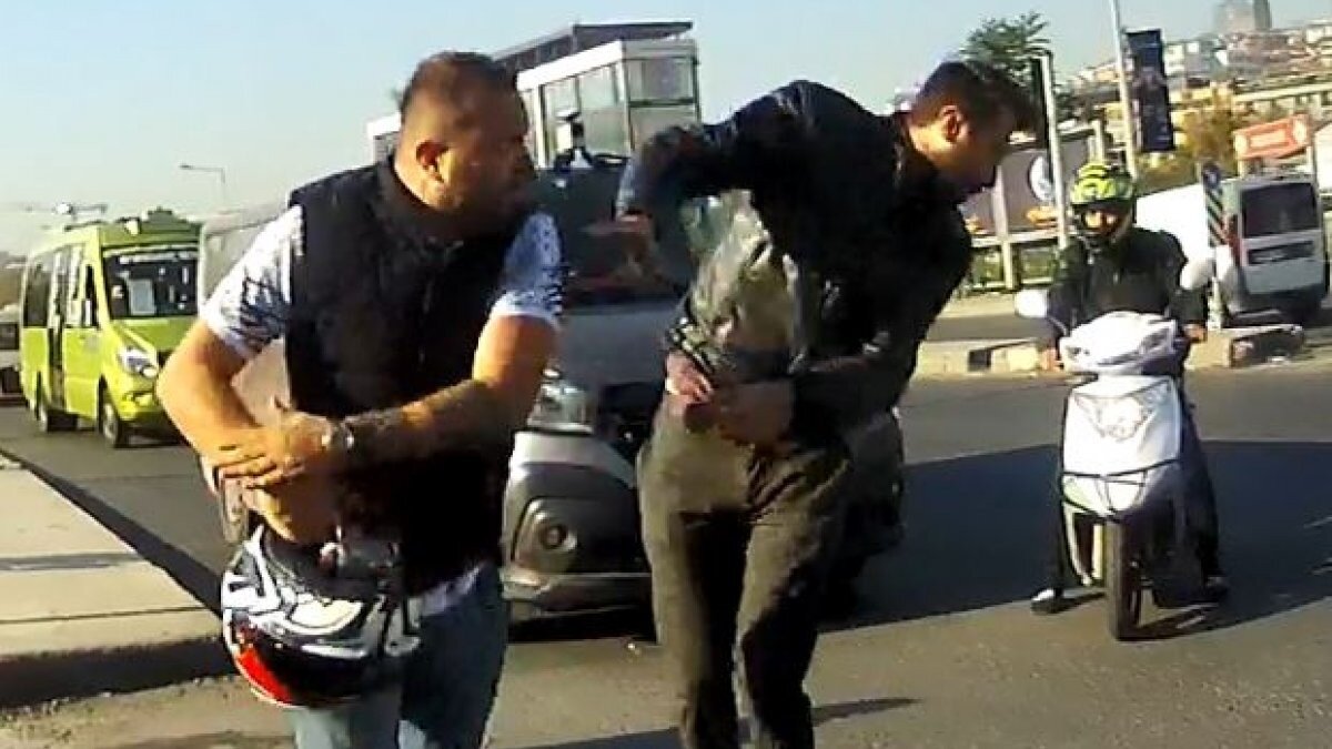 Tartışmanın büyümesi üzerine otomobil sürücüsü, motosiklet sürücüsünün önünü keserek aracını durdurdu.