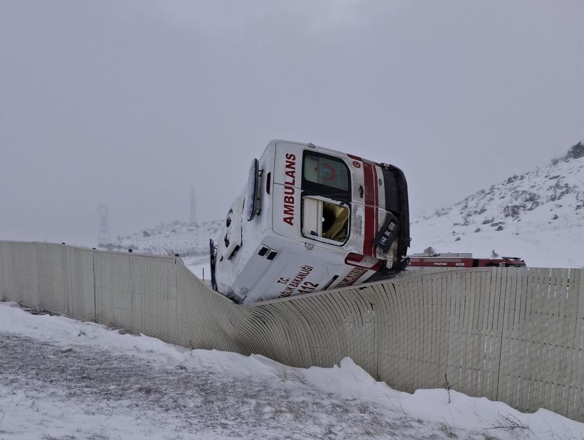 Kahramanmaraş'ın Elbistan-Nurhak karayolu üzerinde meydana gelen kazada, ambulans seyir halindeyken, karlı yolda sürücüsünün direksiyon hakimiyetini kaybetmesi sonucu yoldan çıktı.