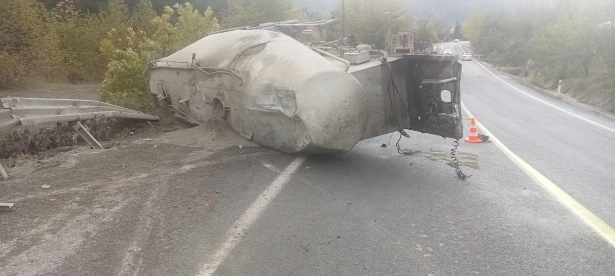 Öğle saatlerinde Andırın-Kadirli kara yolu Çatak mevkiinde Hanifi Yanar yönetimindeki beton mikseri, yağış nedeniyle kayganlaşan yolda kontrolden çıktı.