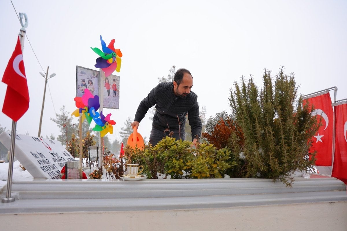 Depremde ailesini kaybeden baba, yaşadığı büyük acıya rağmen hayata tutunmaya çalışırken Kapıçam Şehir Mezarlığı'nda bulunan eşi ve çocuklarının olduğu kabri hemen hemen her gün ziyaret ediyor.