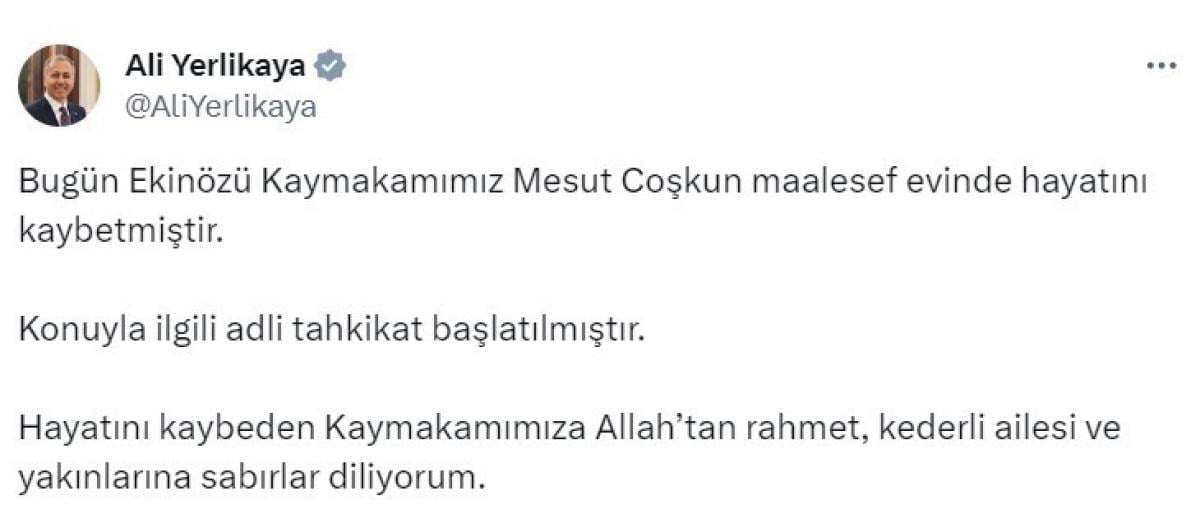 Bakan Yerlikaya, X hesabından yaptığı paylaşımda, Ekinözü Kaymakamı Mesut Coşkun’un hayatını kaybettiğini belirterek, "Konuyla ilgili adli tahkikat başlatılmıştır. Hayatını kaybeden Kaymakamımıza Allah’tan rahmet, kederli ailesi ve yakınlarına sabırlar diliyorum." ifadelerine yer verdi.