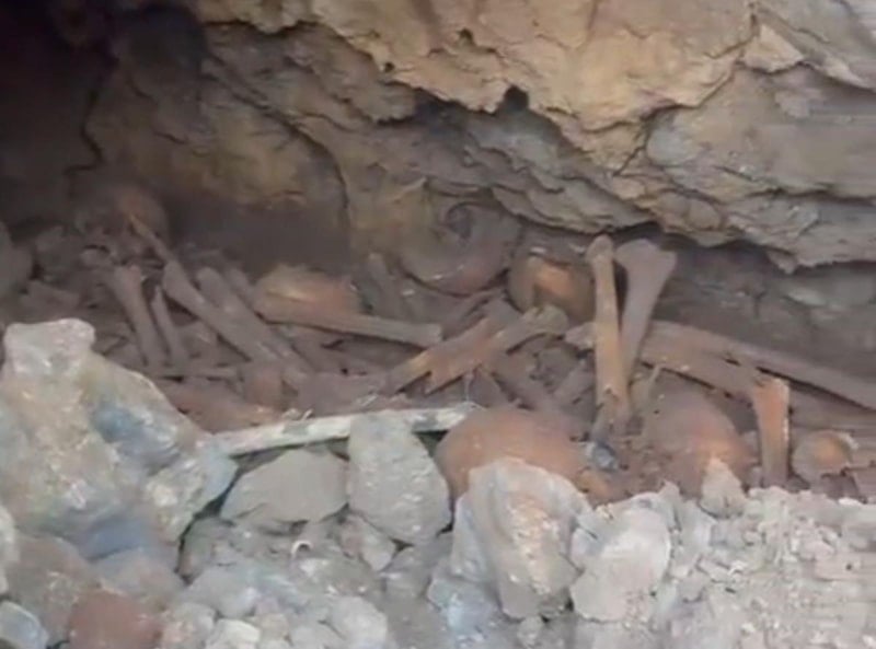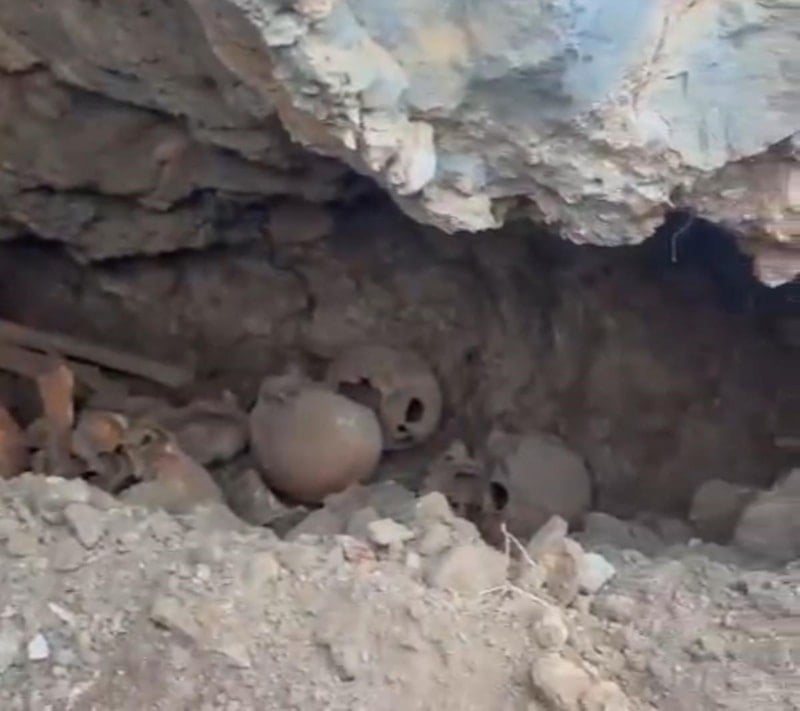 Kayanın kaldırılmasıyla birlikte ortaya çıkan mağarayı andıran yerde çok sayıda insan kafatası ve kemikleri görüldü.