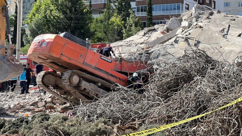 Yıkım devam ederken henüz belirlenemeyen bir nedenle iş makinesi, binanın çökmesiyle birlikte enkaz altında kaldı.