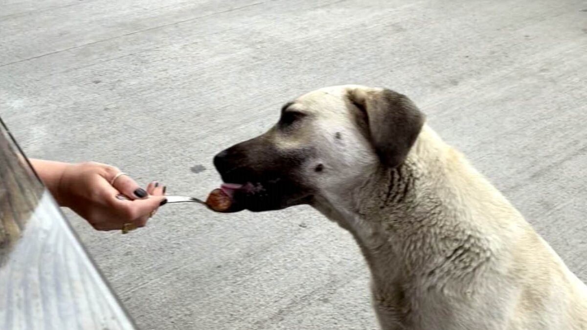 Şenol, yemek yerken bu sırada yanlarına sokak köpeği geldi. Köpeğin aç olduğunu fark eden Sema Şenol, yemek yediği kaşıkla köpeğe de yedirdi.