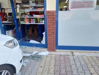 Şans eseri kazada yaralanan olmazken, otomobilin ön kısmında ve marketin camında maddi hasar oluştu.