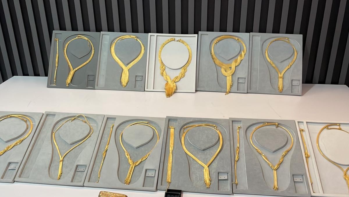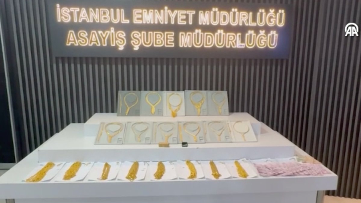 Çeşitli suçlardan 7 kaydı bulunan B.A'nın aracında ele geçirilen 96 altın kolyenin yanı sıra sahte olduğu belirlenen 1 külçe altın, 6 künye, 11 kolye, 10 çift küpe, 27 pırlanta taş ile 9 bin 970 lira emniyette sergilendi.