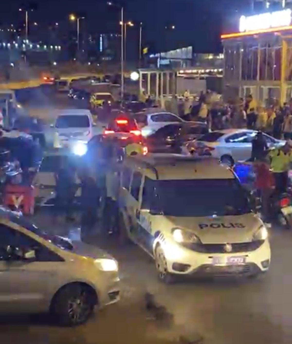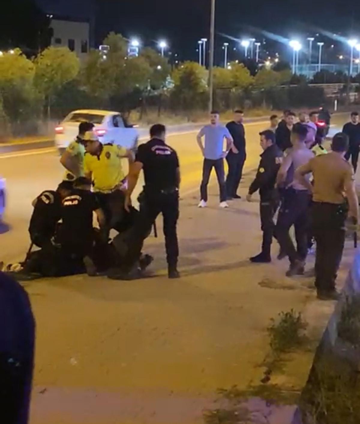 Şüpheliler E.E., N.D. ve Y.E.E., olay yerine gelen diğer kolluk kuvvetlerince emniyete götürülürken N.D., ekip aracına zarar verdi.