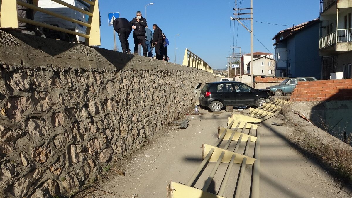 Çarpışmanın etkisiyle araçlardan biri yoldan çıkıp korkulukları yıkarak 2 metre yükseklikten aşağıya düştü.