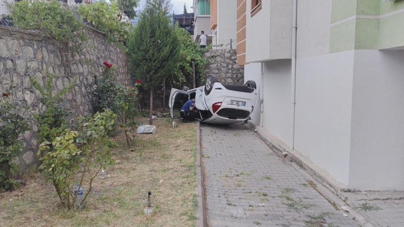 Çarpışmanın etkisiyle kontrolden çıkan otomobil, apartmanın bahçesine devrildi.