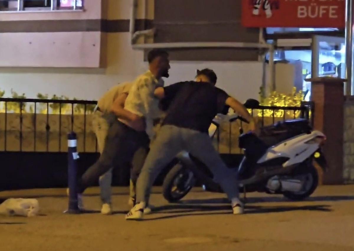 Bir kişinin ayırmak için tuttuğu şahsa diğerlerinin ıstaka, yumruk ve tekmelerle saldırdığı anlar görüntülere yansıdı.