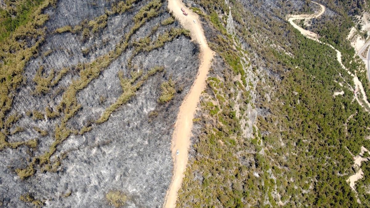 Yaklaşık 90 hektarlık ormanlık alanın etkilendiği yangında zarar gören bölge havadan görüntülendi.