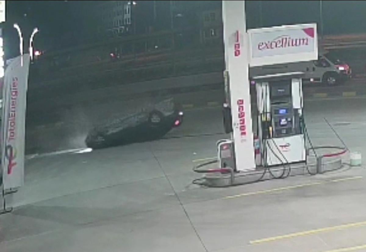 Sürücünün yaralandığı kaza anı ise akaryakıt istasyonunun güvenlik kamerasına saniye saniye kaydedildi.