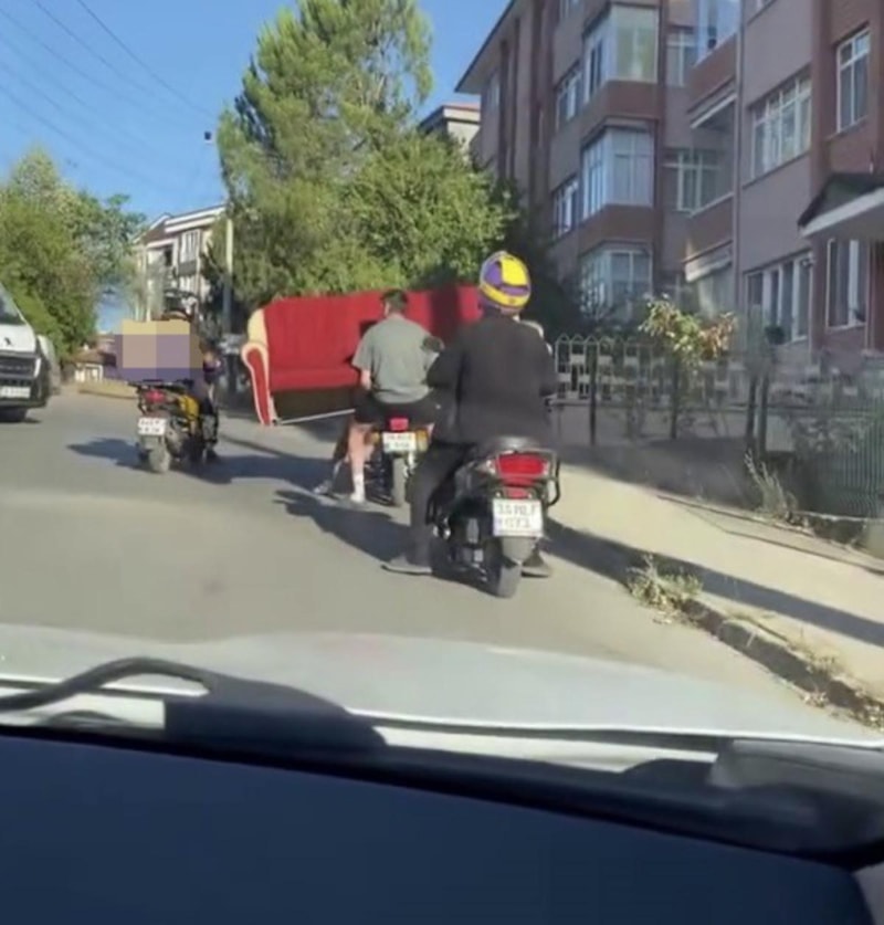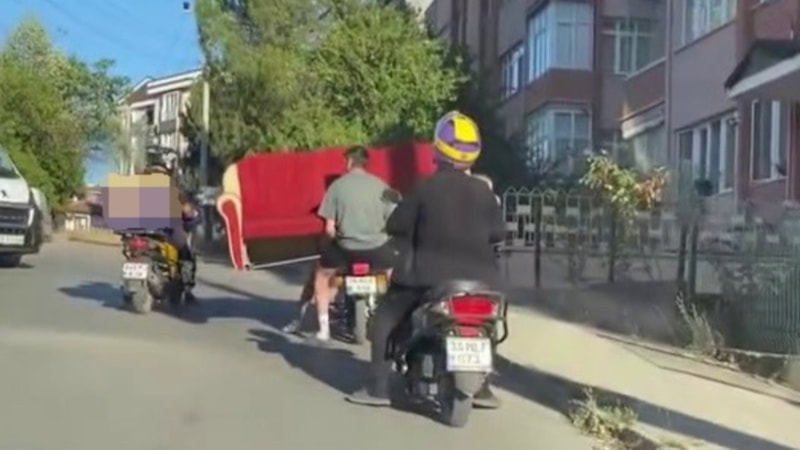 Karabük'ün Safranbolu ilçesine bağlı Emek Mahallesi'nde meydana gelen olayda, seyir halindeki motosiklette bulunan iki kişi, aralarına yerleştirdikleri koltukla yolculuk yaptı.