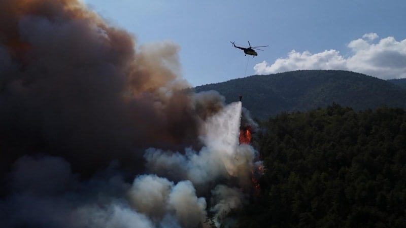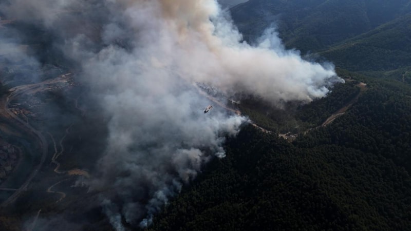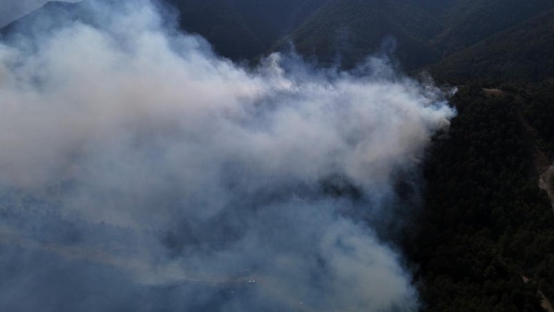 Zaman zaman etkisini artıran rüzgar, alevlerin yayılmasına neden olurken, ekipler yangının yerleşimlere ulaşmasını engellemek için hem karadan hem havadan söndürme çalışmalarını sürdürüyor.
